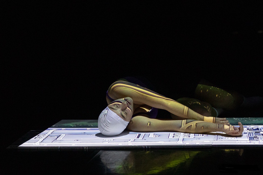 Tre performer emergono da un ambiente scuro, dove la luce è poca e dove l’acqua è più una proiezione che una realtà tangibile. Diventano pinne e nuotatrici che danzano in apnea. Condividono la loro catena cinetica per poter emergere e finalmente fare il loro primo respiro.